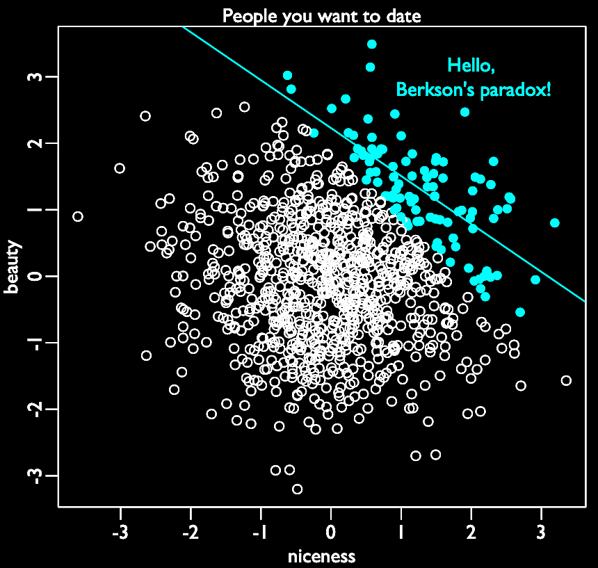 - Berkson’s paradox: named after Berkson (1946), it can be called the selection-distortion effect or conditioning on a collider: here, spurrious correlation is caused by a common effect. The selection bias, or the act of selecting, creates a correlation between unassociated variables. Imagine there are 1 000 persons you could date. Among them, beauty and niceness are randomly distributed and uncorrelated. Some are both, some are neither, and some are either. But you rank the 10% you want to date, weighting beauty and niceness equally. Your strong selection induces a (strong, negative) correlation between the unrelated beauty and niceness. How is that magic possible? Because the people you selected are either beautiful and/or nice, and because you avoid dating people who are neither nice nor beautiful. This selection creates this distortion. If you don’t believe me, check the simulation below!- See also: collider, selection