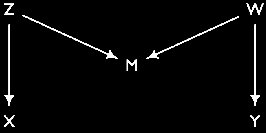- M-Bias: Controlling for a collider that is a pre-treatment variable. Here Z is a (latent) cause of X, the treatment, and W the (latent) cause of Y, the outcome. Z and W are uncorrelated in the simple version of the M-bias.